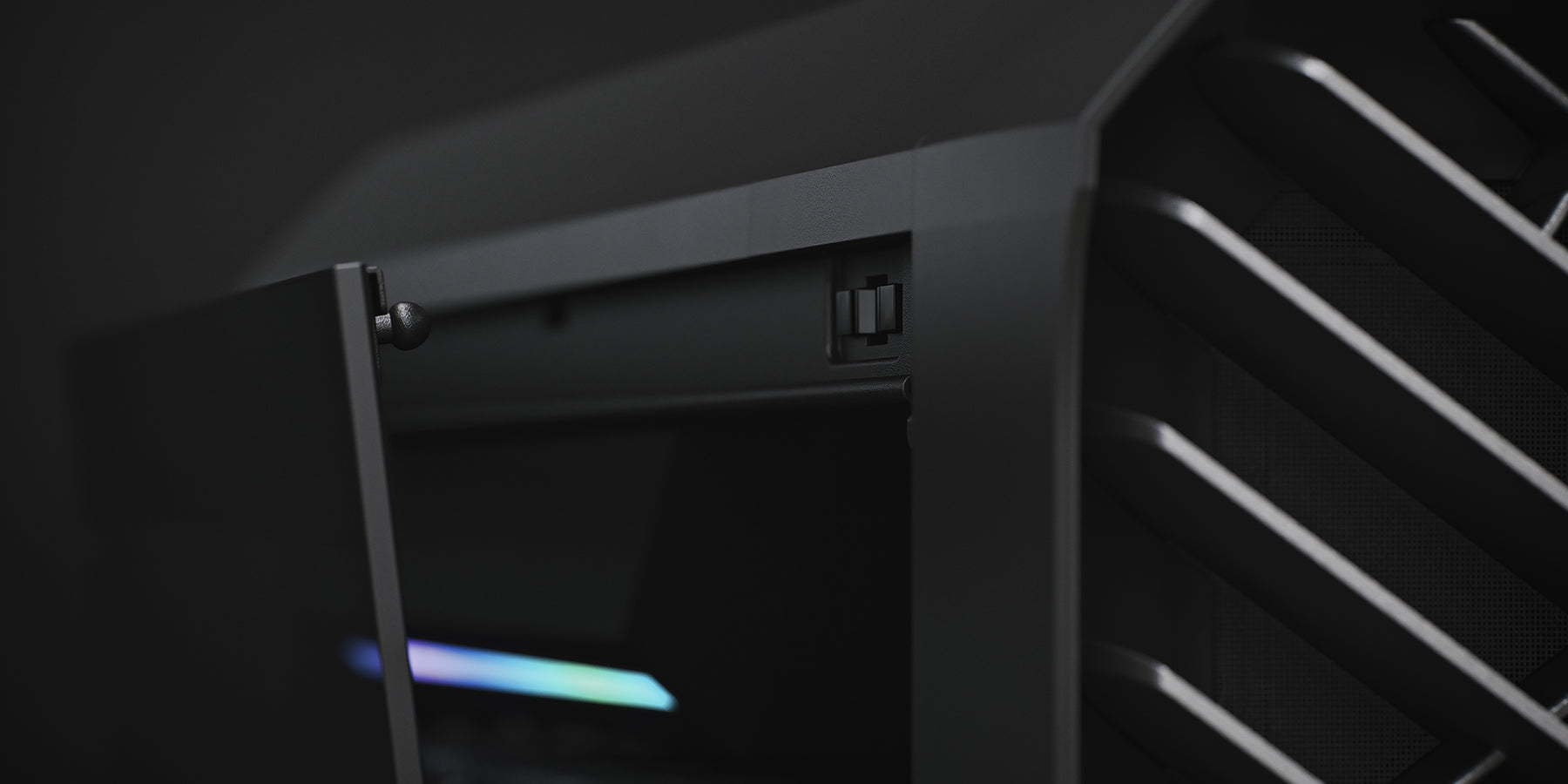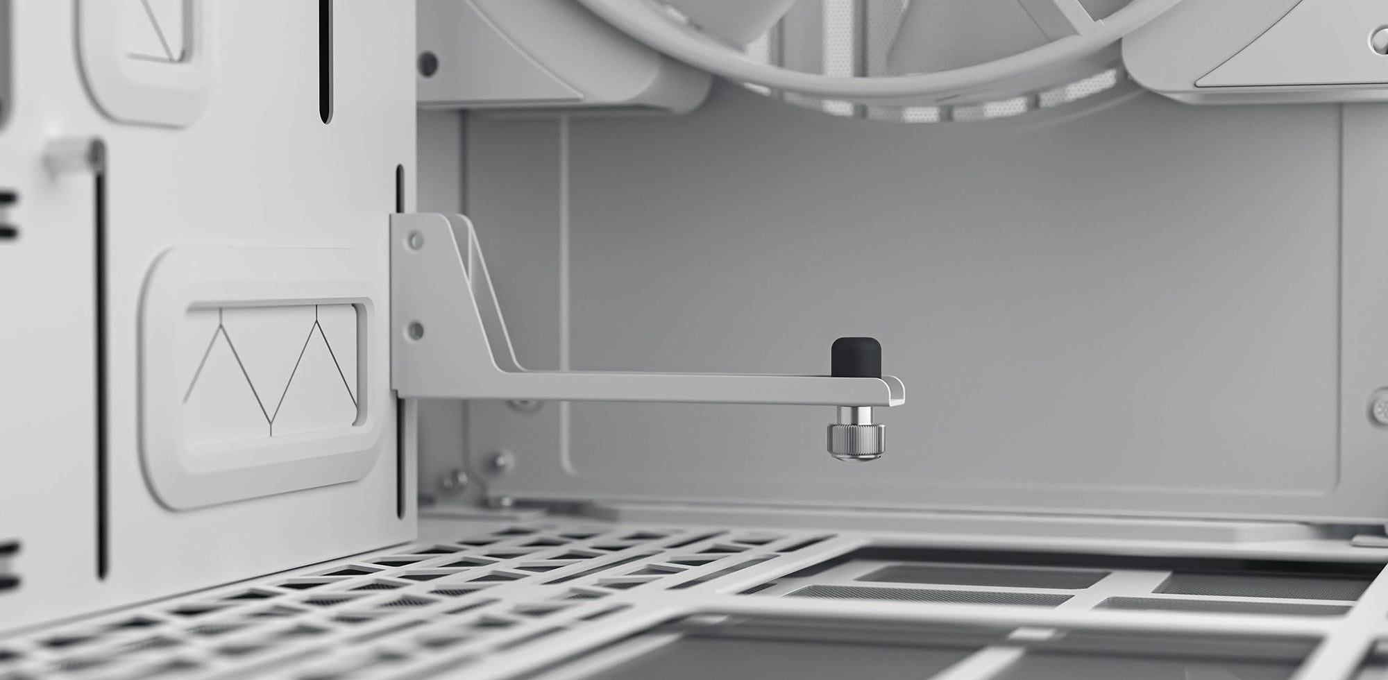 空間經過最佳化配置,仍可容納最厚達 3 插槽、長度達 335mm 的顯示卡。主機板托盤整合水冷儲水罐安裝支援,擴充散熱系統更具彈性。隨附顯示卡支撐架,協助顯示卡保持水平安裝,提升穩定性與耐用性。