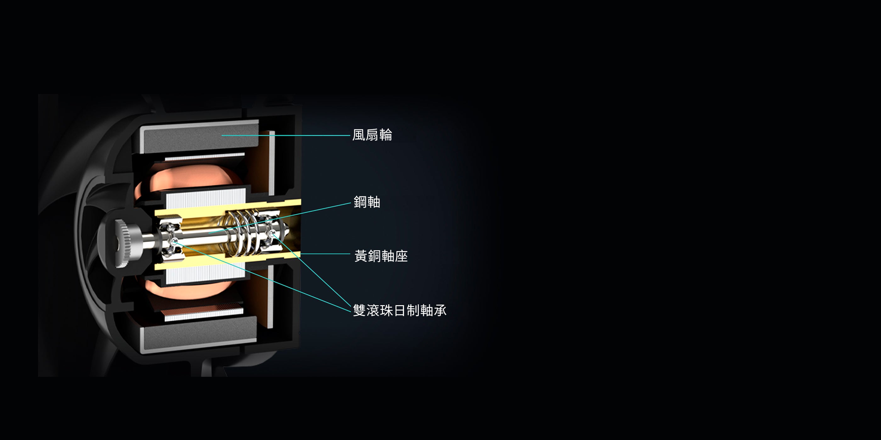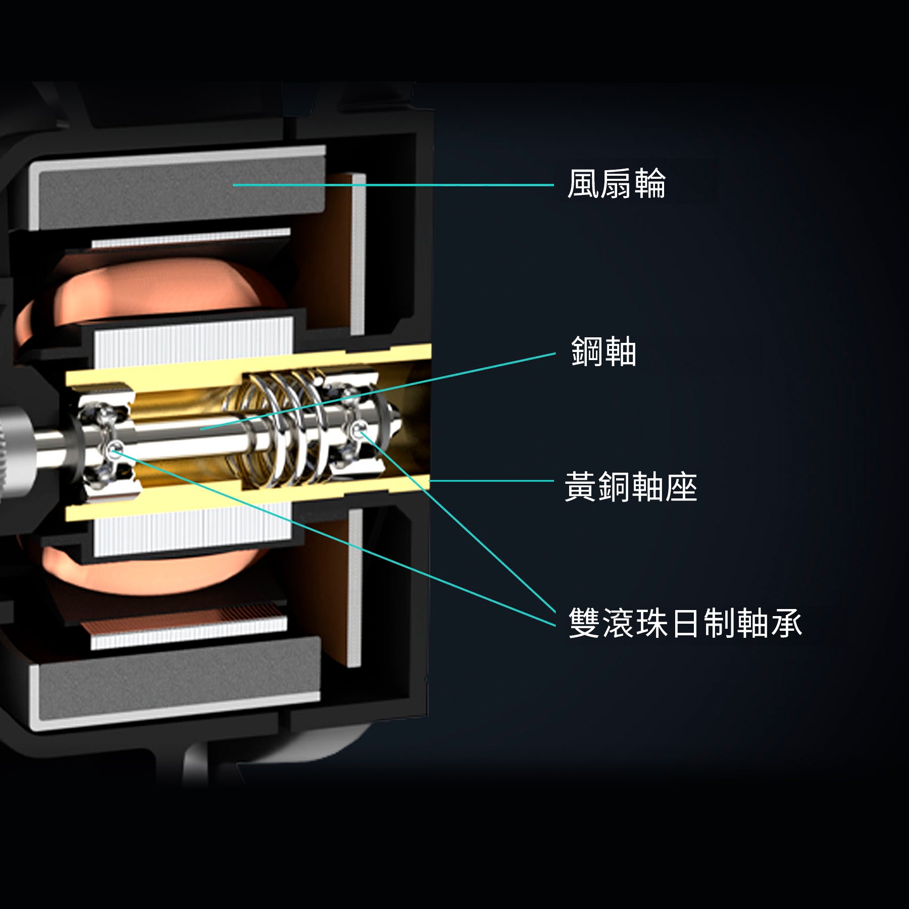 低耗電量、搭載高品質日制雙滾軸承與黃銅軸座,延長風扇使用壽命。