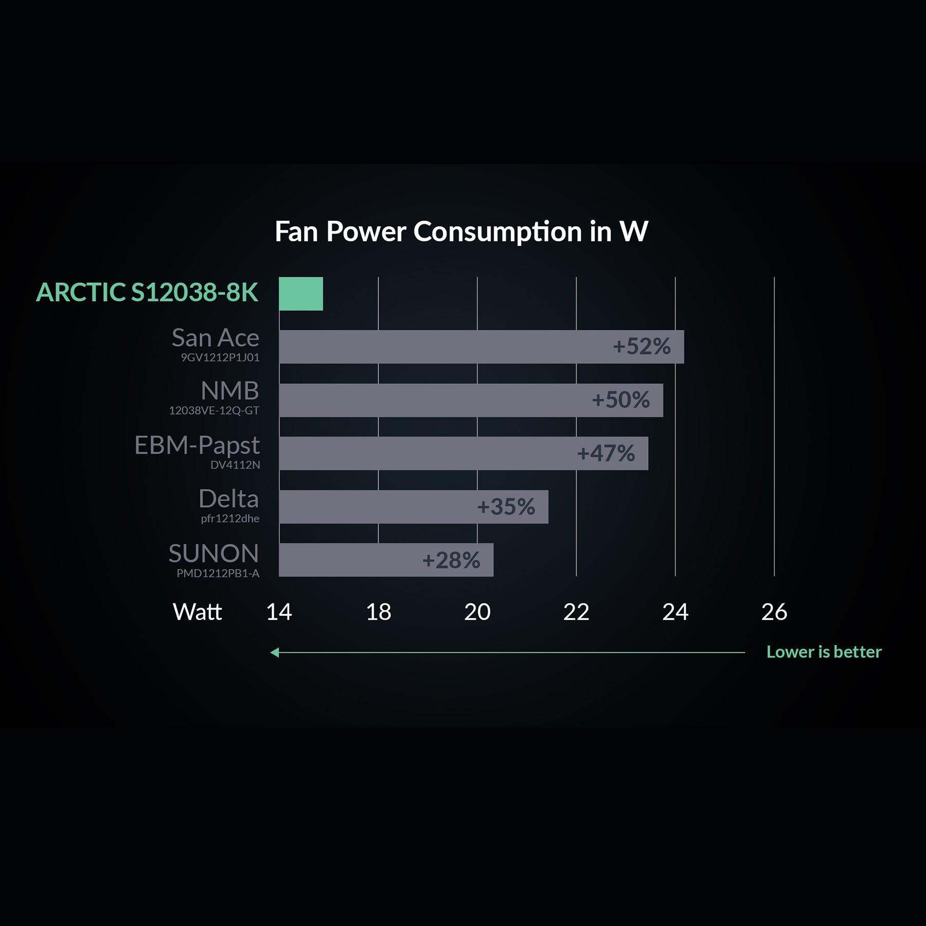在相同效能下,S12038 的功耗比其他爭對手低22%,從而提高了伺服器的能源效率。功耗的降低是 ARCTIC 工程師數月馬達優化的結果,旨在提高 IT 設備的效率。