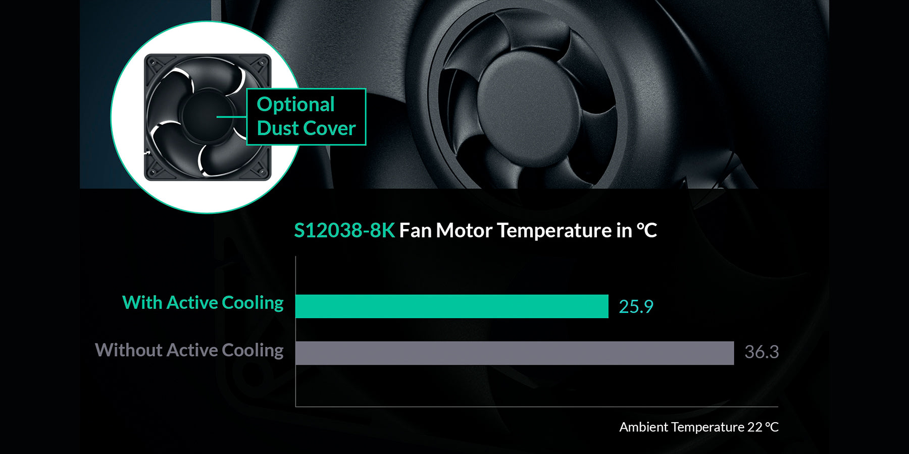 馬達溫度降低 10°C 可使使用壽命延長約一倍。S12038-8K 的馬達不僅特別高效,風扇中心軸上有額外葉輪,進行主動散熱。另外附有防塵貼膜,可覆貼至風扇中心軸,因應多塵使用環境。