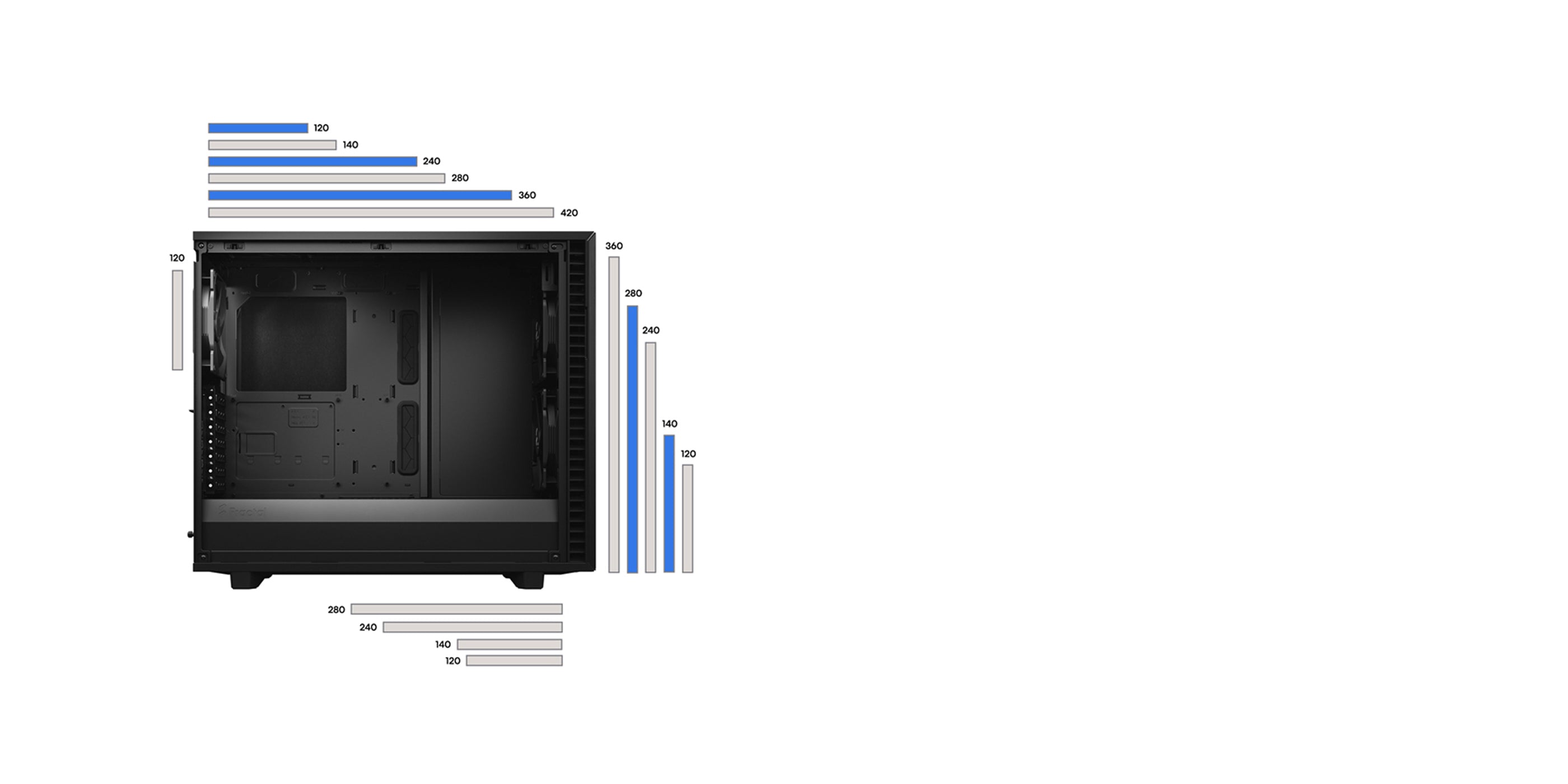 最大支持頂部420mm,前部360mm,底部280mm水冷排。(備註:安裝頂部140/280/420水冷排時,主機板零件高度限制36mm)
