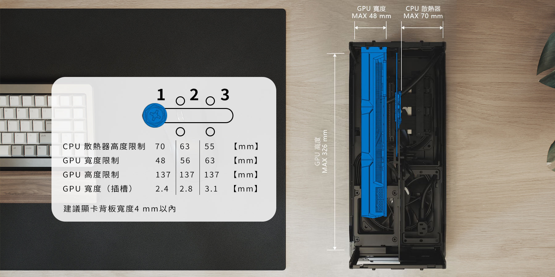 安裝長度達326 mm的顯卡,並與最大280 mm的散熱器搭配,實現強大的SFF遊戲性能