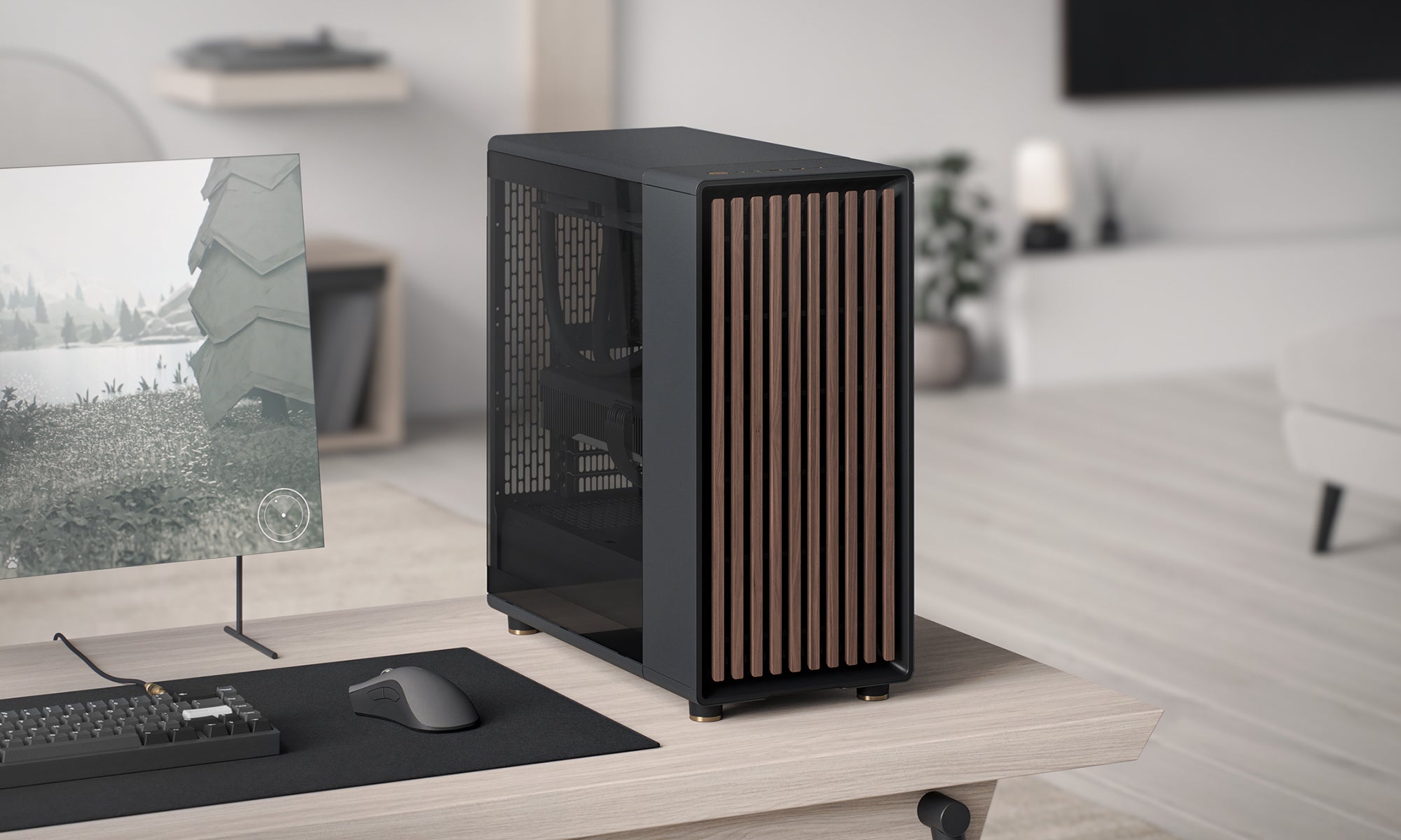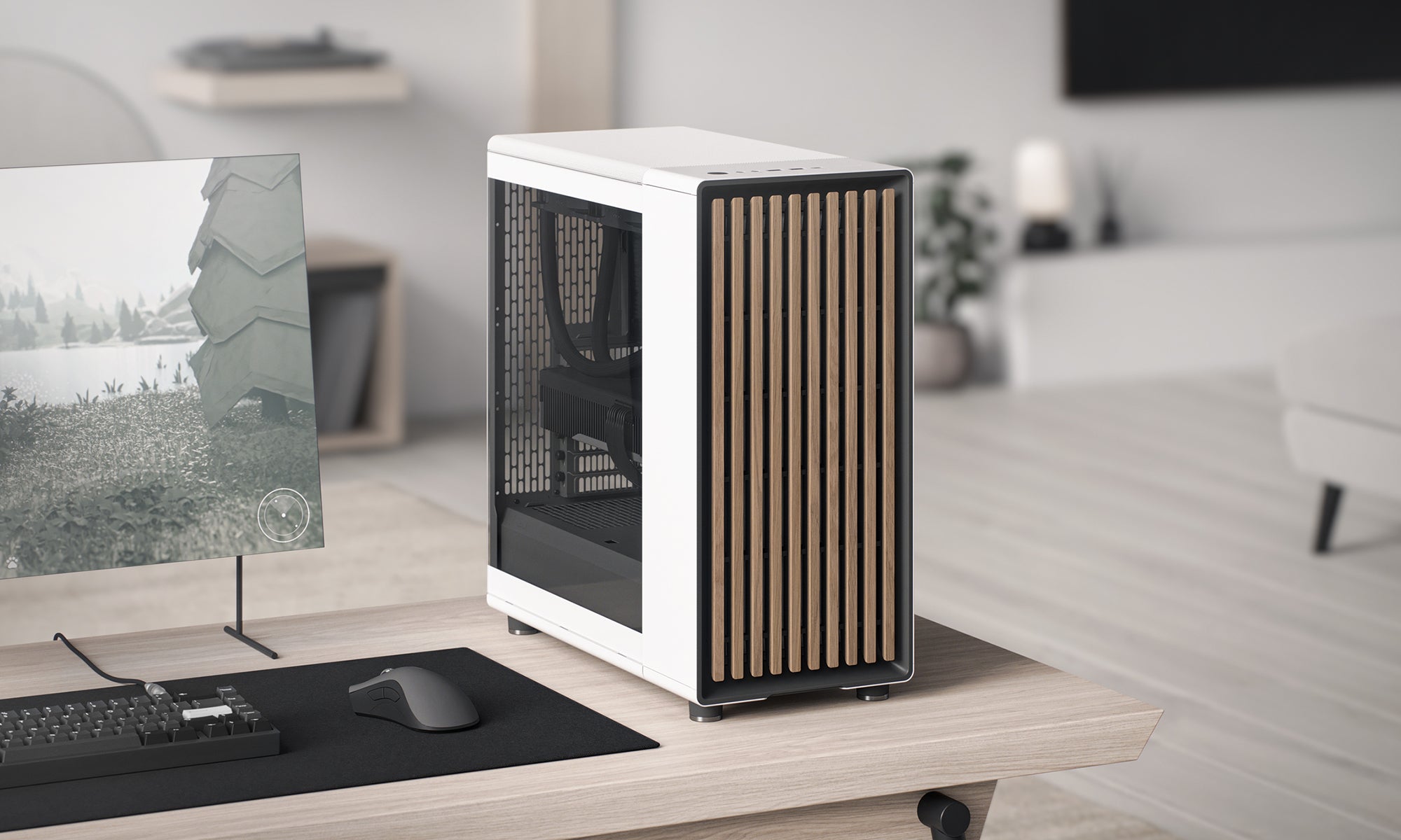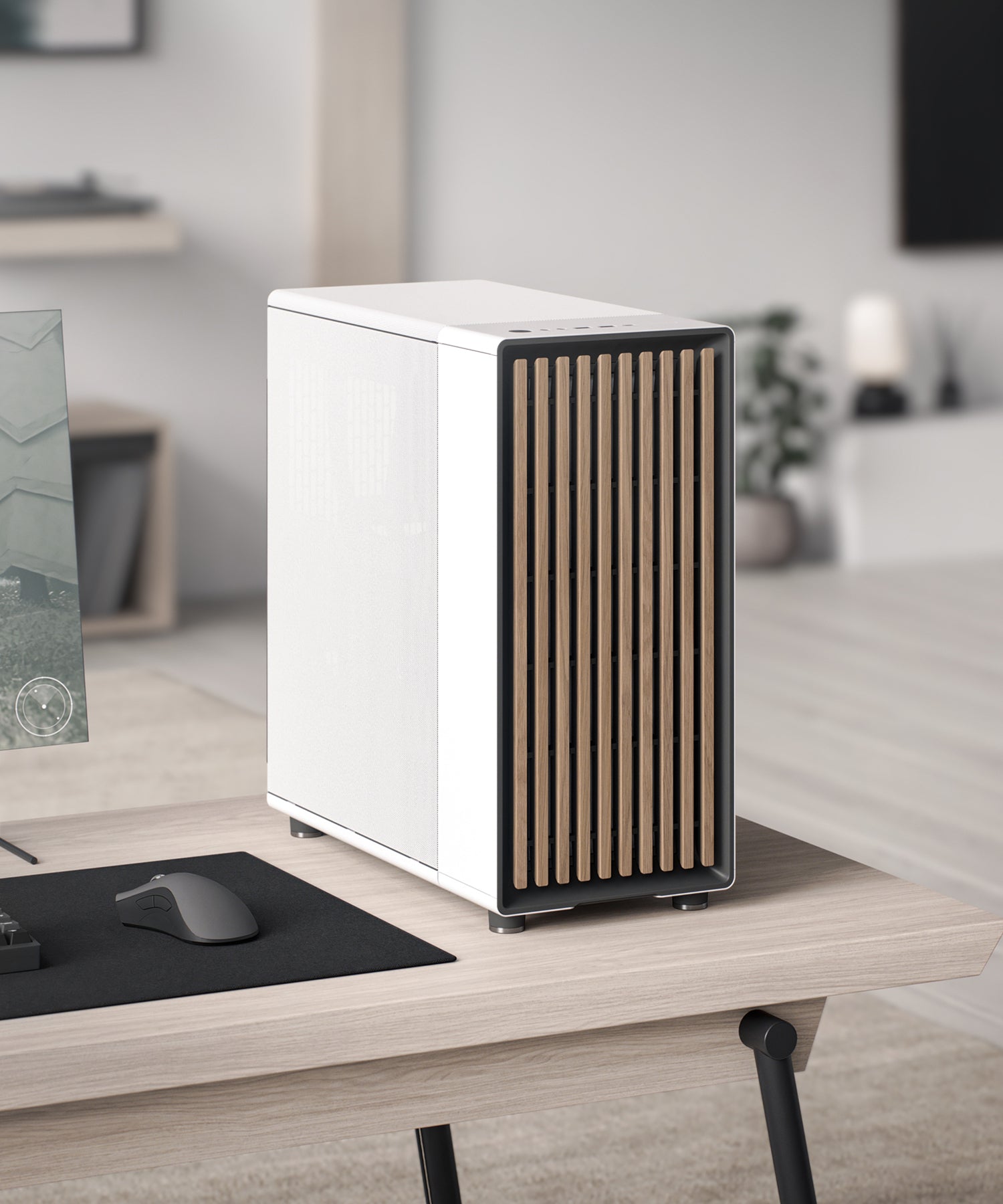 前面板實木設計,為你的電競設備增添自然美感,融入你的家居生活(黑色為胡桃木條,白色為橡木條)