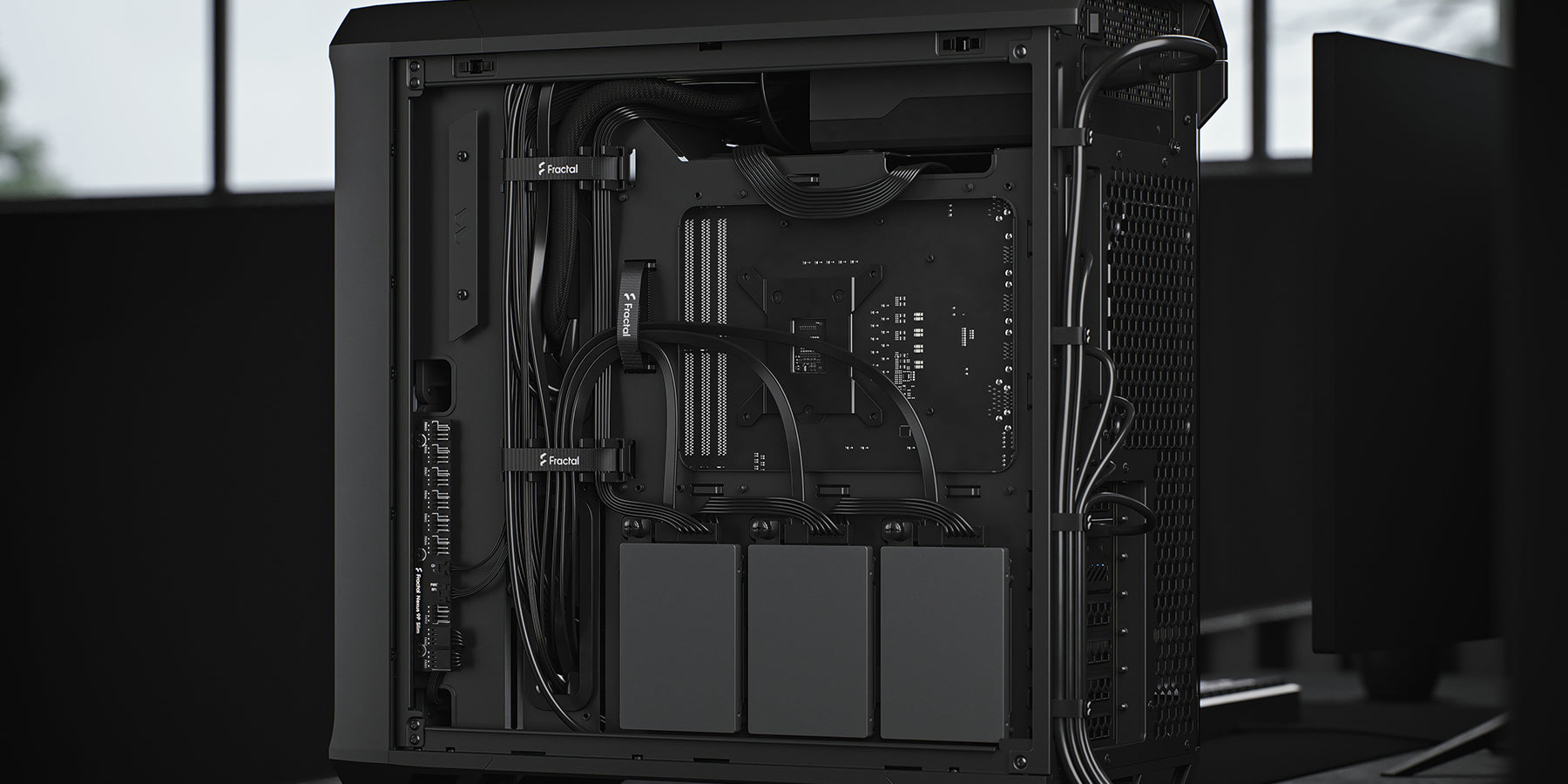 可拆式頂部飾板與理線夾扣搭配束線帶,讓安裝與線材管理更加簡便。堅固的減震硬碟托盤可支援一顆 HDD 或兩顆 SSD,並提供兩種可選安裝位置。另附三組專用 SSD 固定架,擴充儲存更具彈性。