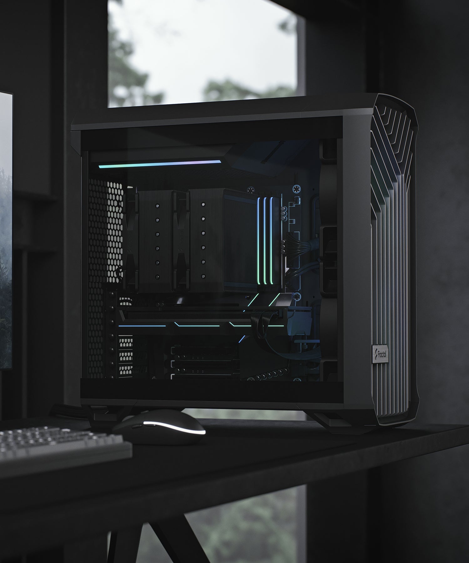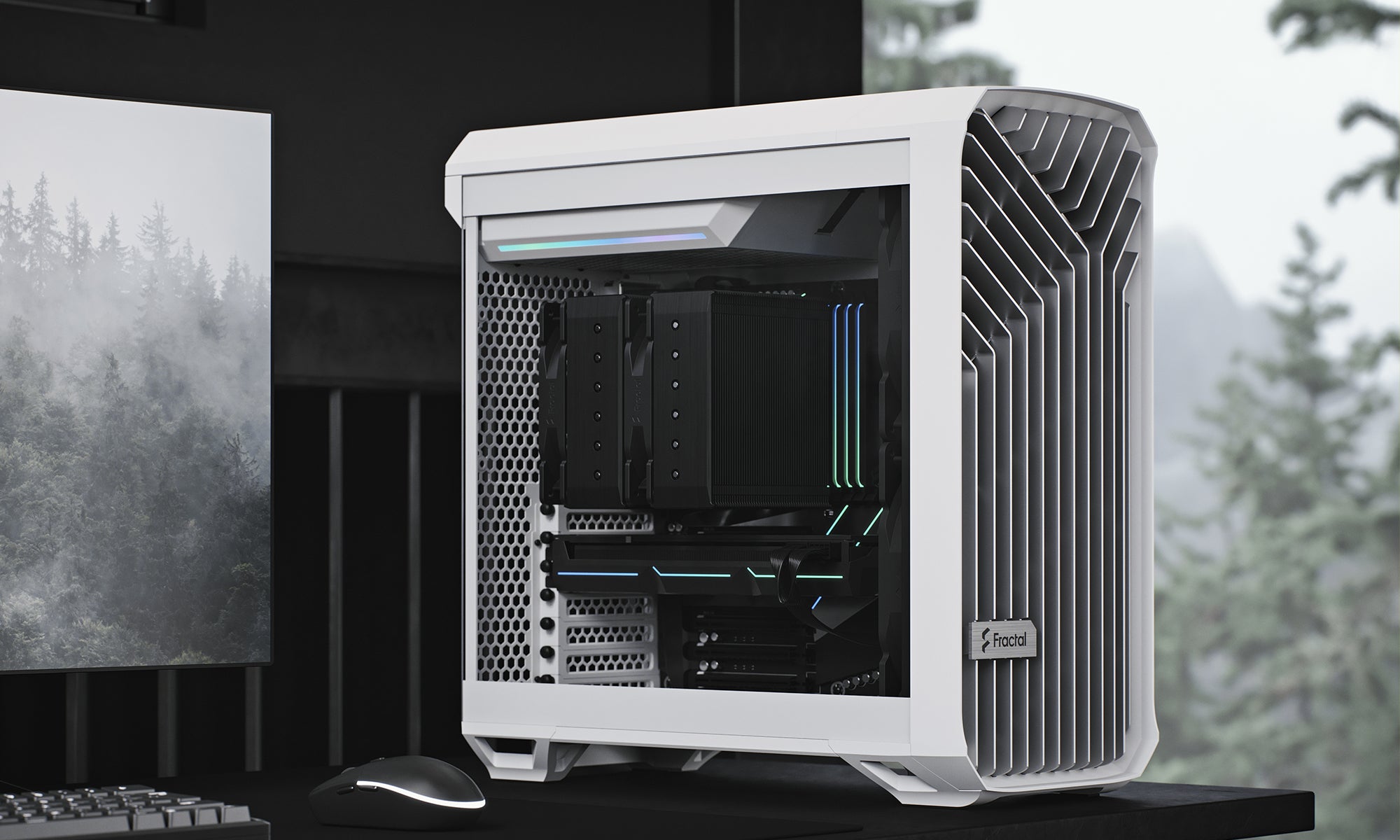 一體式強化玻璃側板搭配免螺絲頂部卡扣機構,拆裝更便利。TG 版本配備 LED 燈效,RGB 版本則搭載 RGB 風扇,皆可透過支援 5V 可編程 RGB 的主機板進行燈效控制。頂部配置空氣力學電源遮罩,內建 ARGB 燈條(僅限 TG 與 RGB 版本),展現絢麗視覺效果,讓整體視覺更具層次與動感。