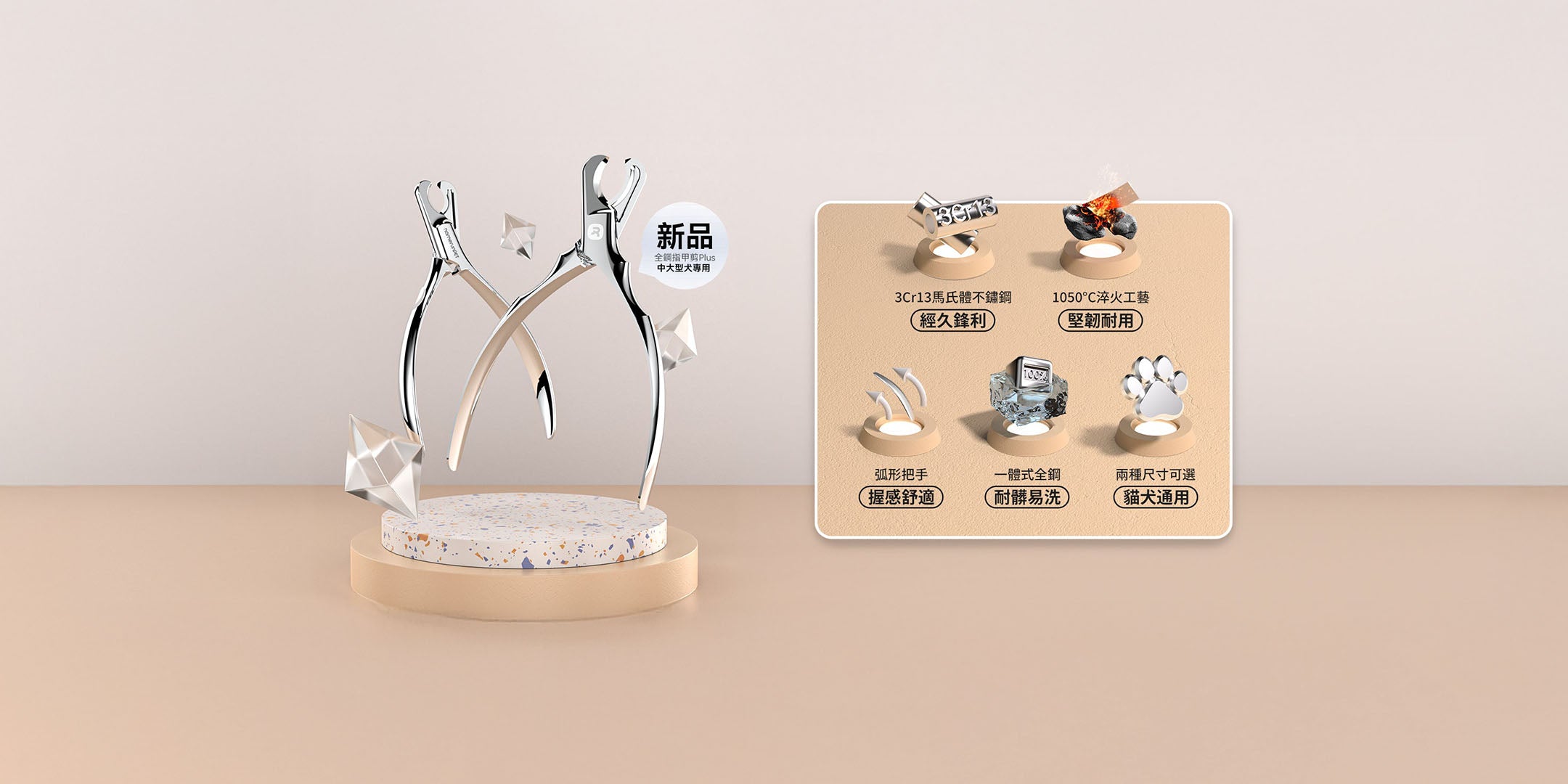 貼合手掌的人體工學,專為愛寵硬指甲設計,握把舒適自動回彈,讓剪甲輕鬆更方便