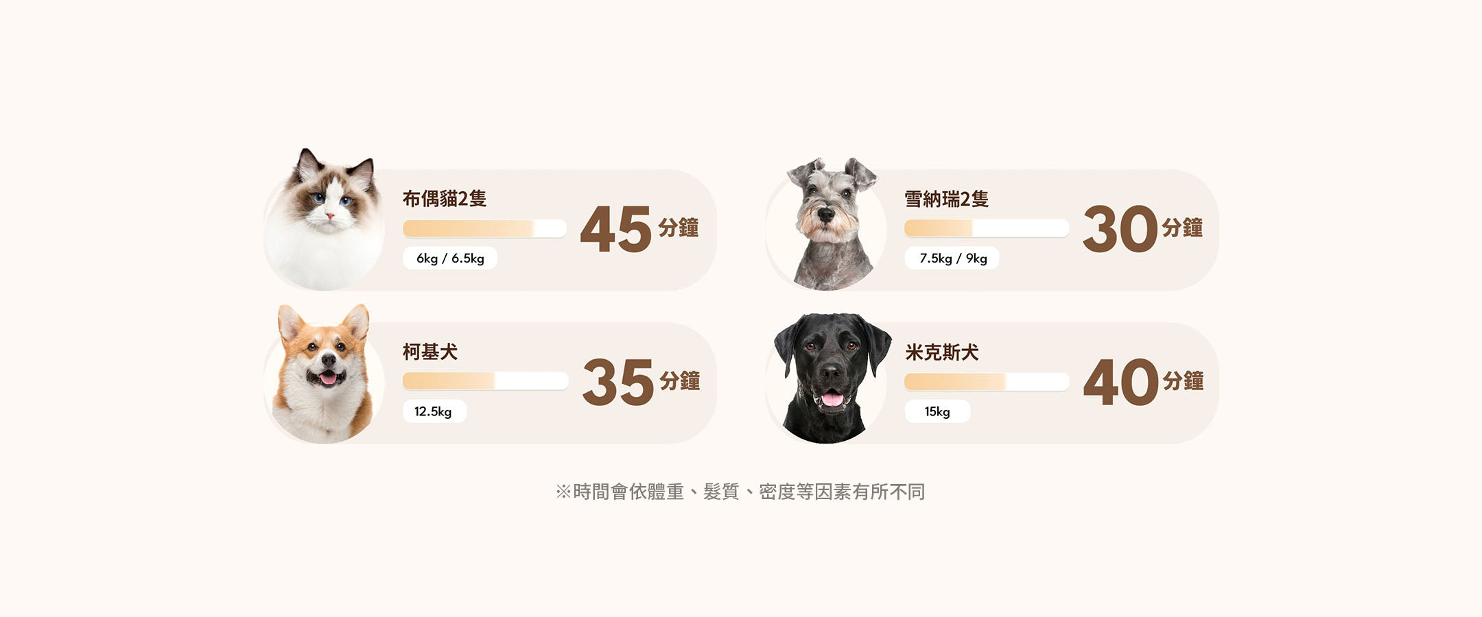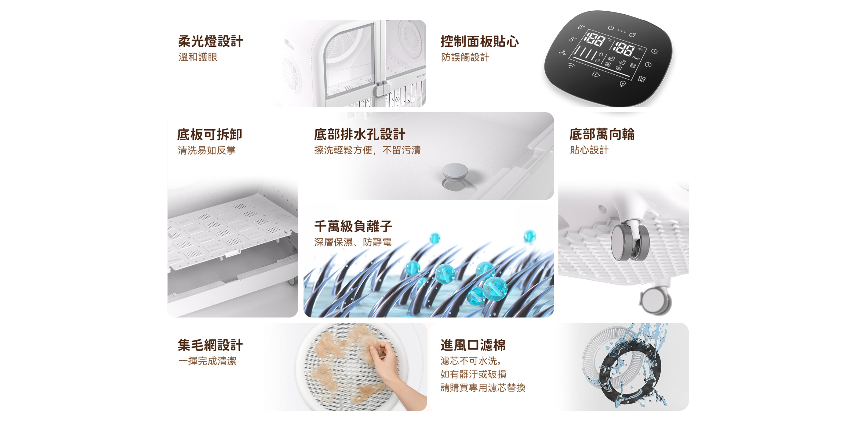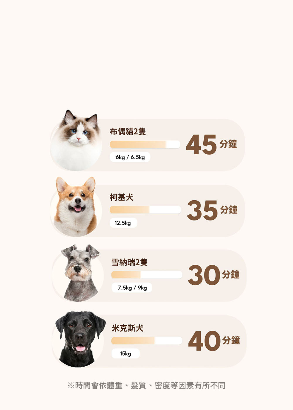 隨心設定模式、溫度、風速、時間、 燈光,尋找最佳舒適圈;省下2倍時間與精力,兩全其美,主人與毛孩都舒服