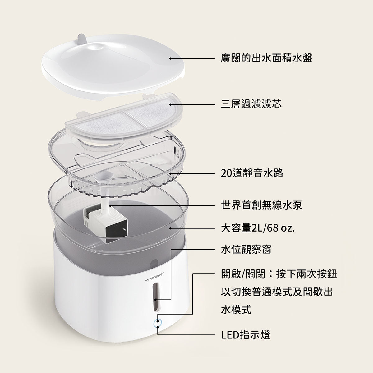 裝載2公升 / 68oz的飲水量,非常適合小型、中型貓犬寵物