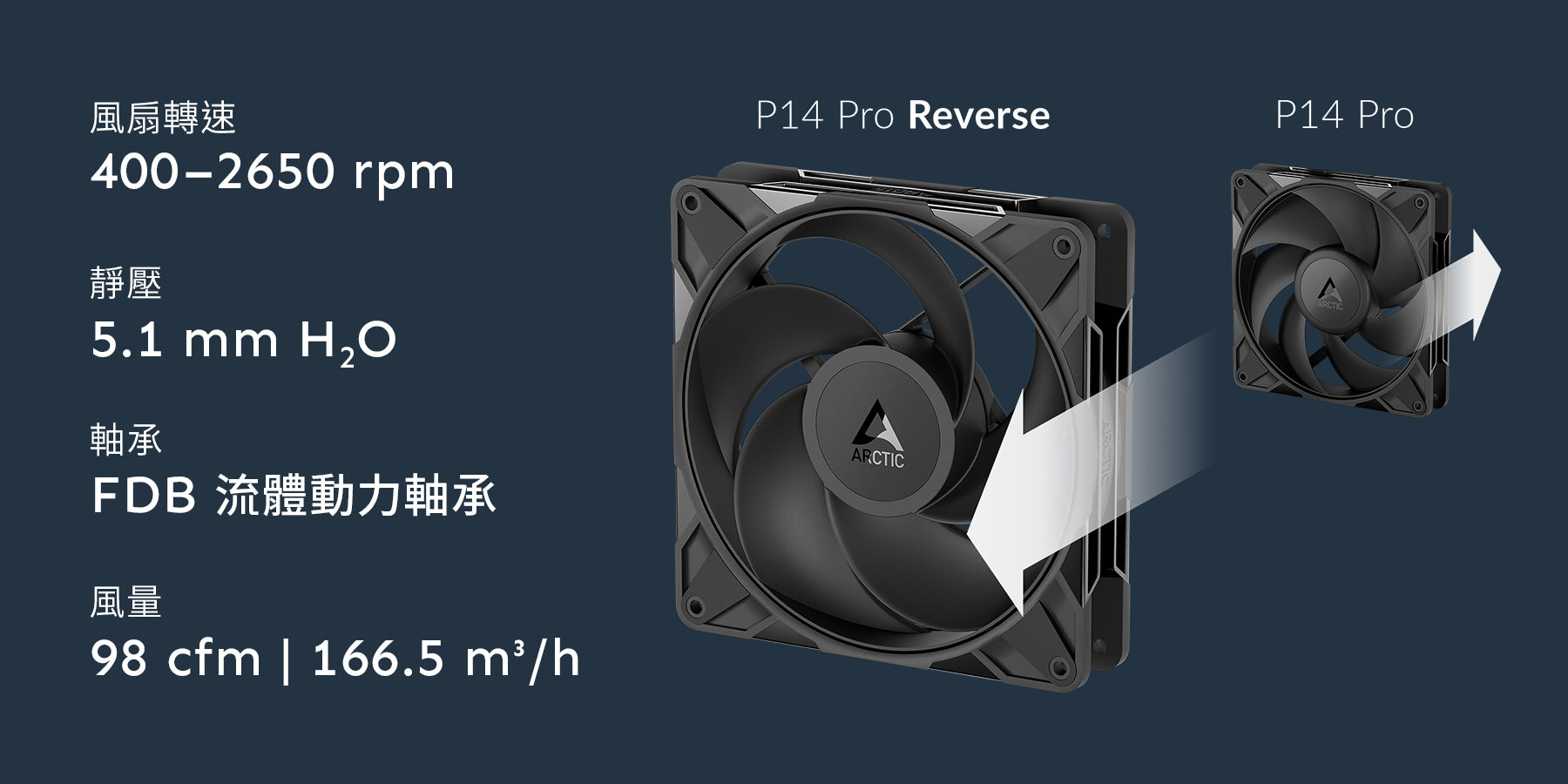 ARCTIC P14 Pro Reverse 是一款 140 mm 的高階反向進氣風扇。它結合了強大的散熱效能與精緻的外觀設計,特別針對現代機殼內部的進氣需求進行優化。