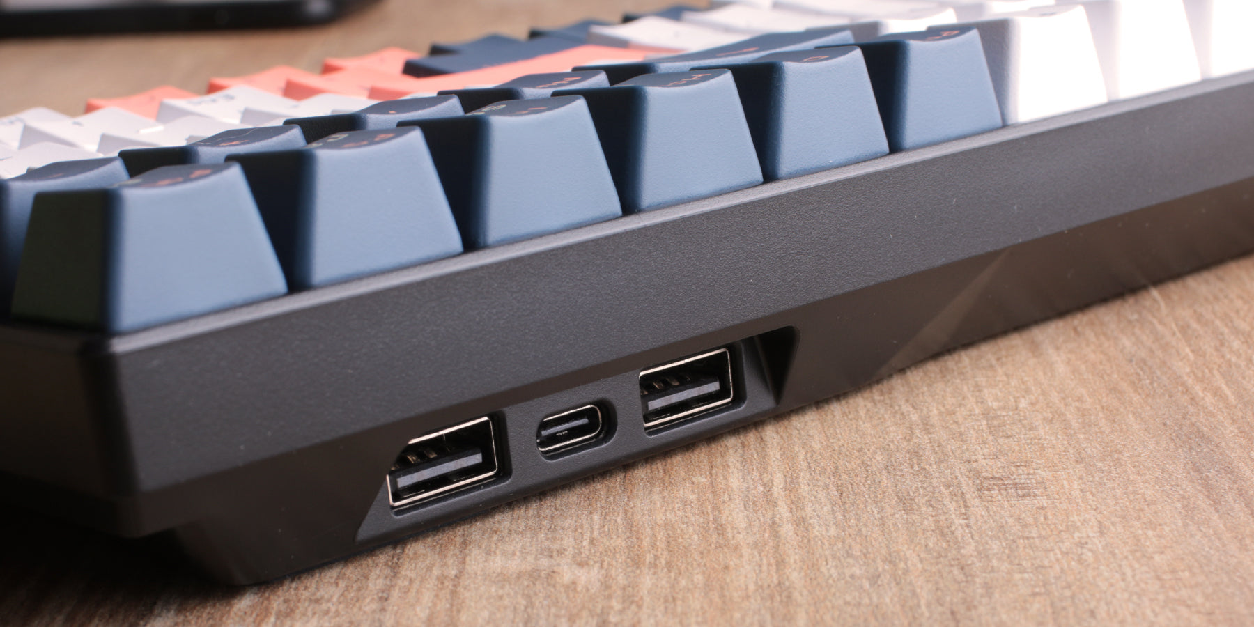 RK 100 在鍵盤身上設置了兩個 USB HUB其他周邊可以直接連接鍵盤,省去找主機USB孔的時間