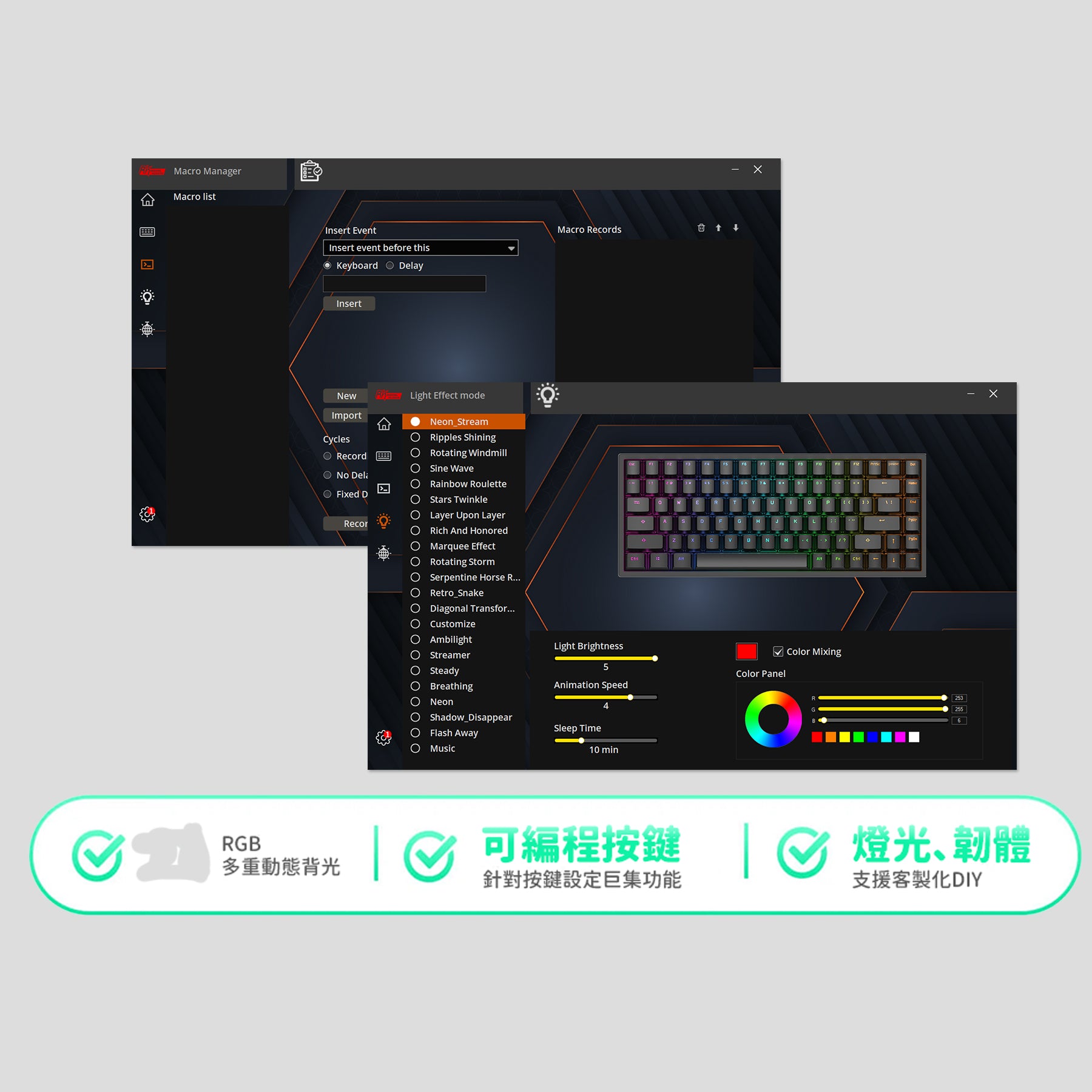 支援自訂義燈光效果、按鍵巨集功能、更新韌體