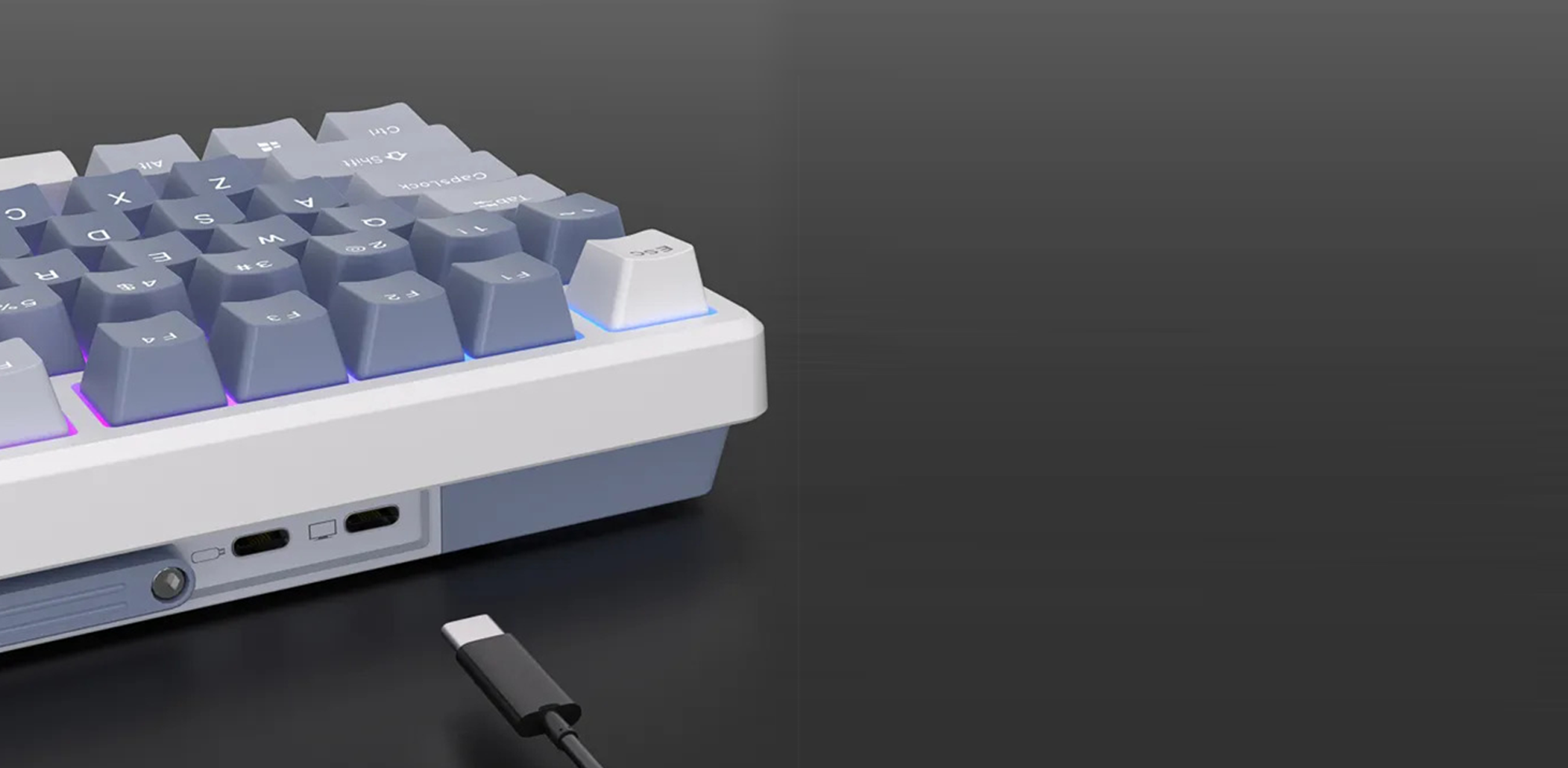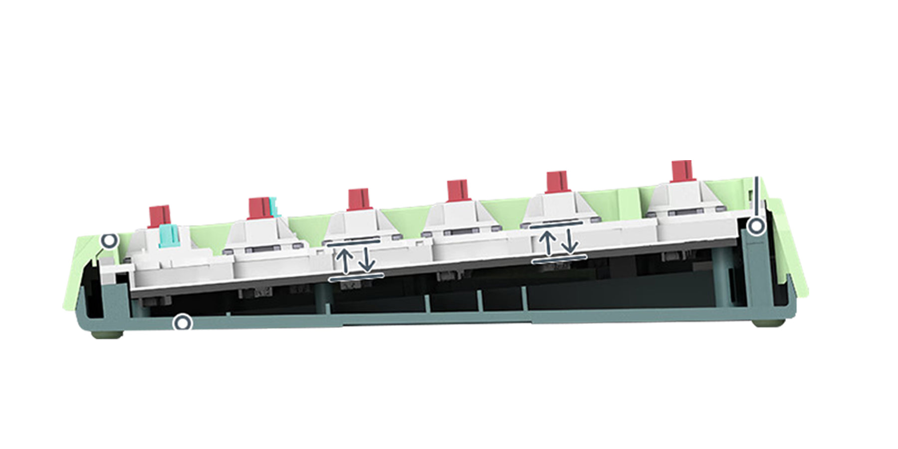 GASKET結構的定位板完全不需要螺絲固定藉由上下殼緊密貼合、鍵盤四周安裝矽膠套以達成軟彈手感鍵盤內部也導入一體式夾心矽膠&軸下墊、底部矽膠墊空格鍵間隙也安裝 EVA 消音棉有效減少鍵盤空腔音,按鍵悅耳舒適